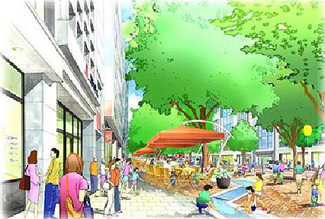 更にオフィスビルの1〜2階に飲食店などの店舗を誘致して歩行者空間の拡充を図るというものです。