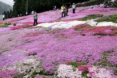 シバザクラがあるのは郡上市明宝奥住の国田さん方の敷地約3000平方メートルで、満開のシバザクラを迎え、多くの見物客でにぎわっているそうです