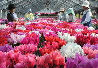 12月までに3万本を扱うという業者では、1500坪の敷地に建つ温室やビニールハウスに赤、ピンク、紫、白など色とりどりのシクラメンが咲き誇り、出荷を待っているといいます